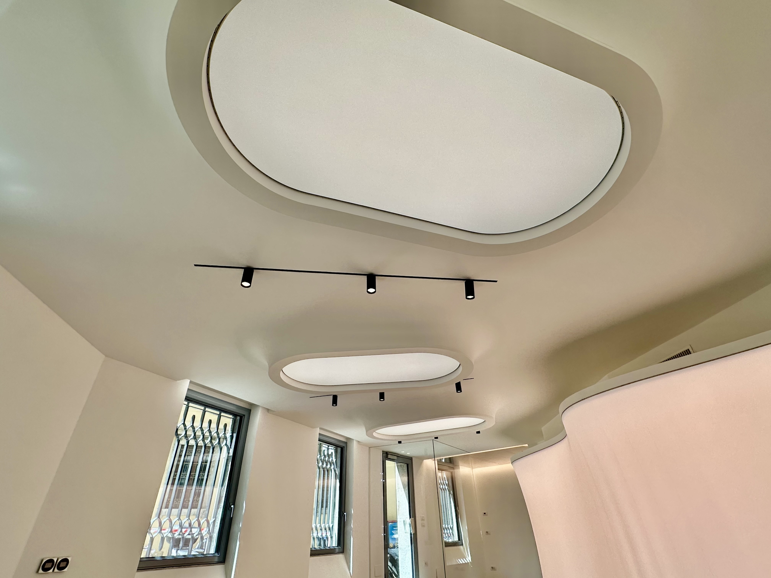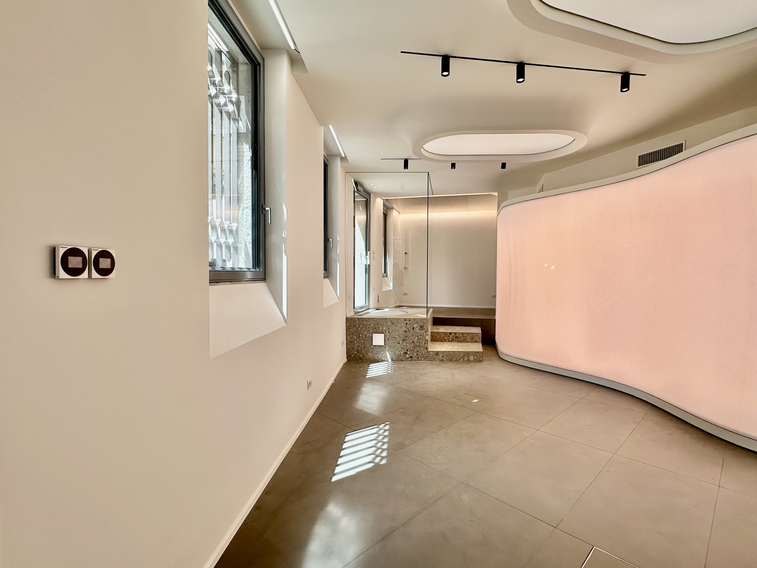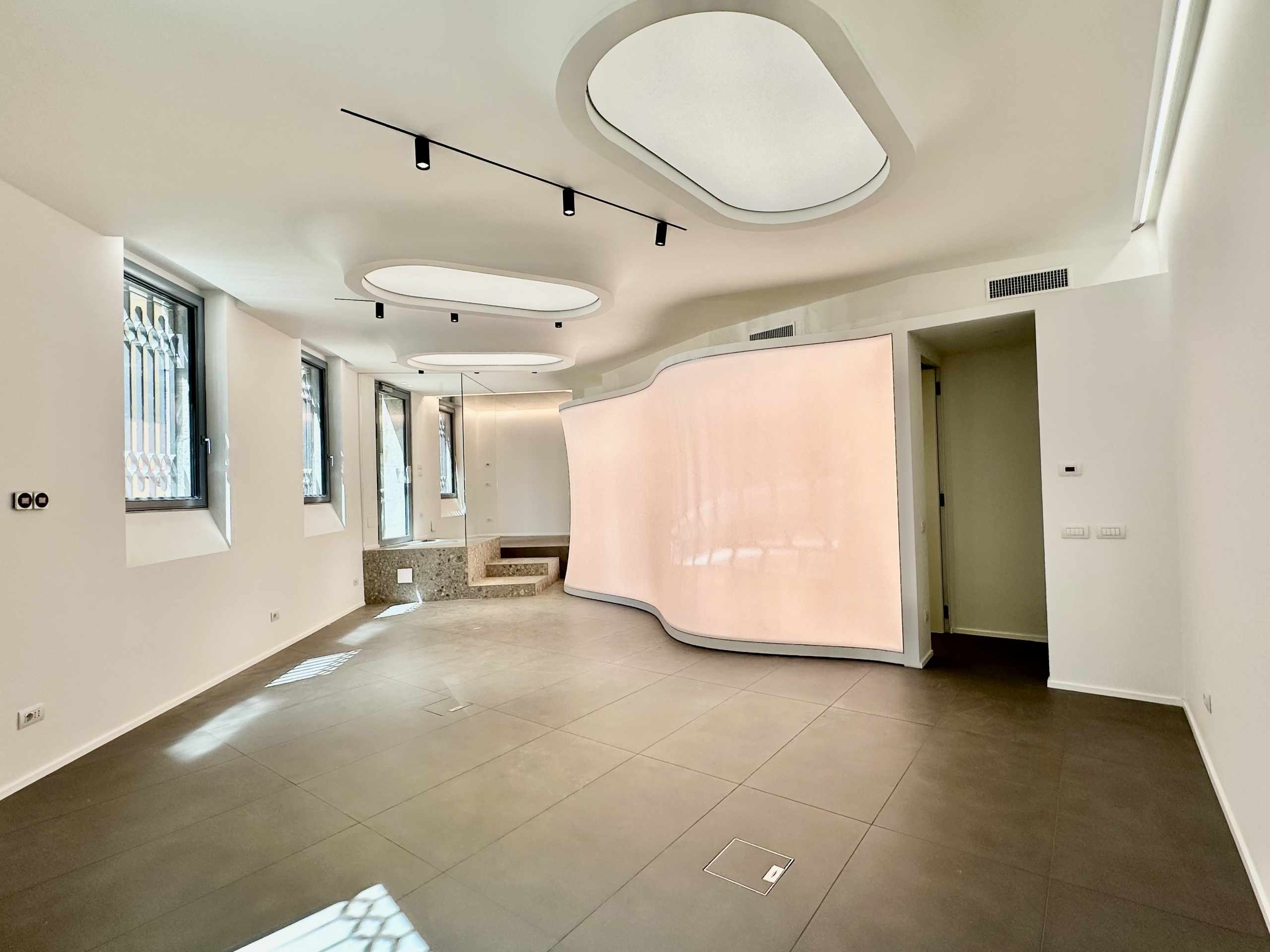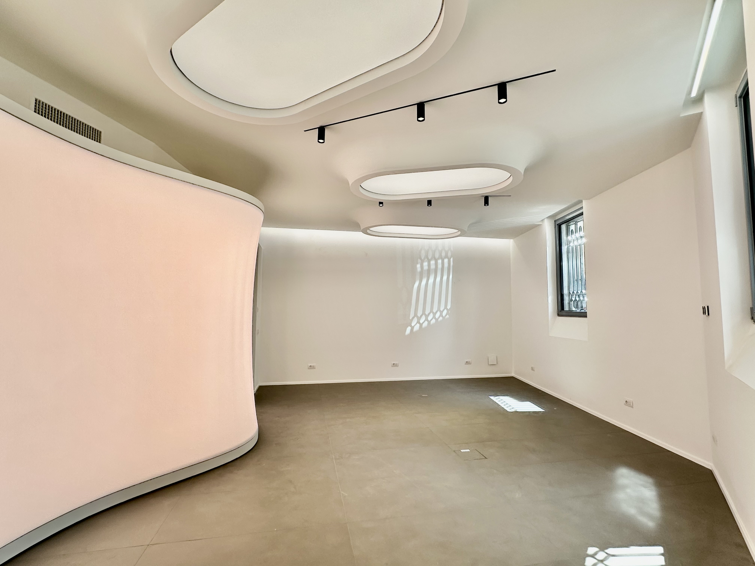L’immobile si distingue per uno stile architettonico moderno e raffinato: ambienti curvi, pareti retroilluminate, grandi finestre con inferriate artistiche e controsoffitti scenografici con illuminazione a LED integrata. La disposizione open space lo rende estremamente versatile, ideale per studi professionali, showroom, agenzie creative o boutique office.Caratteristiche principali: