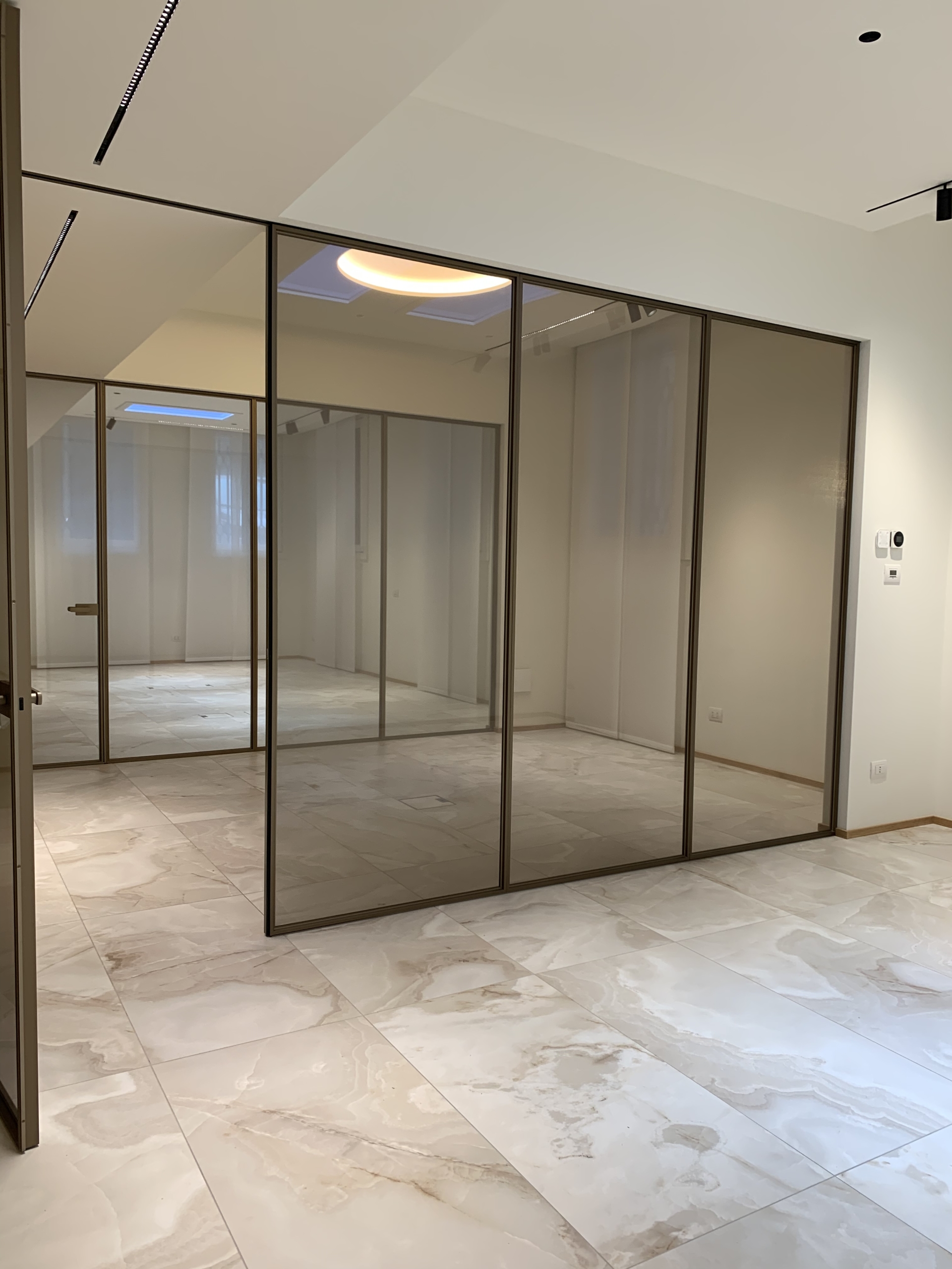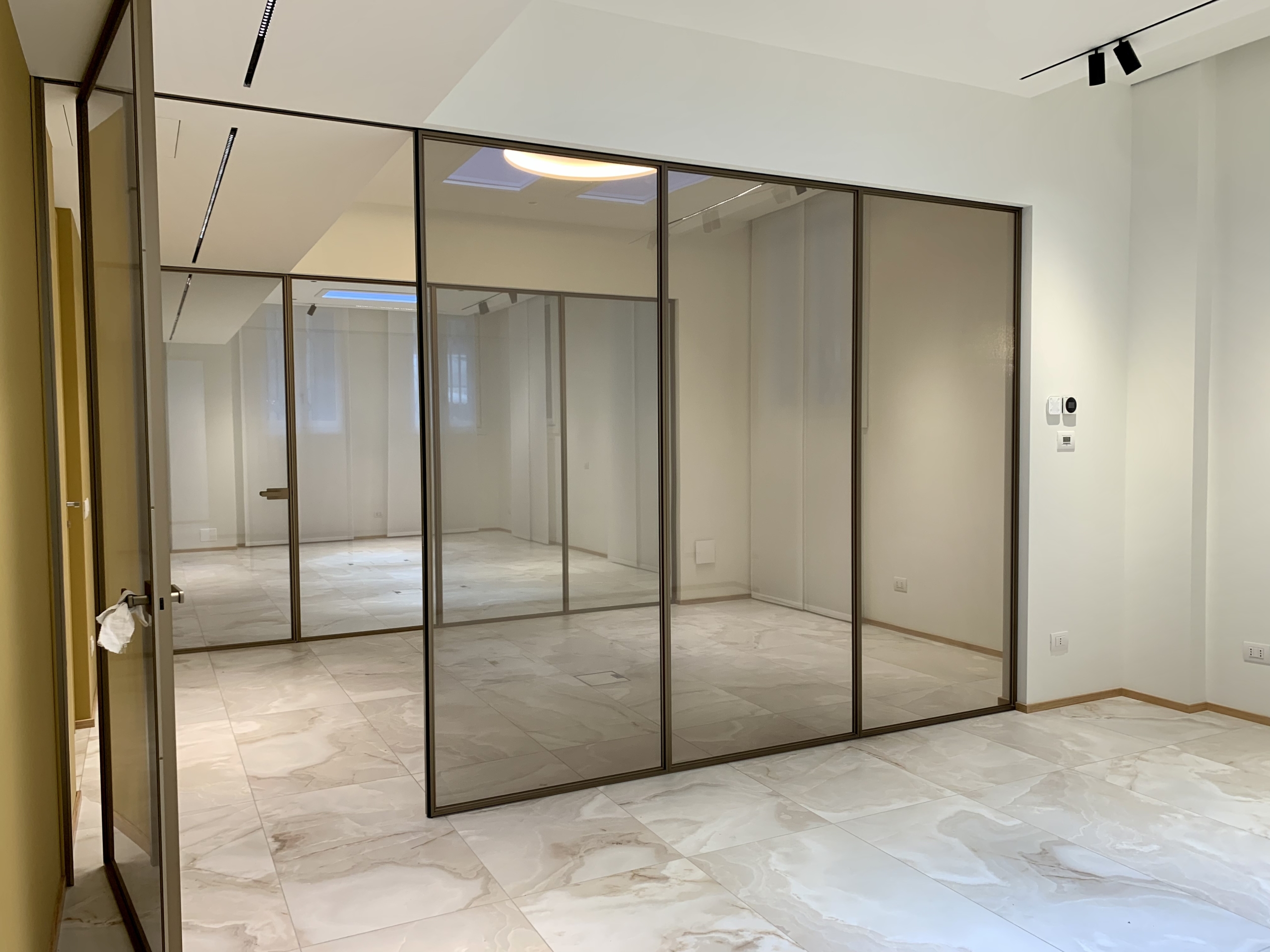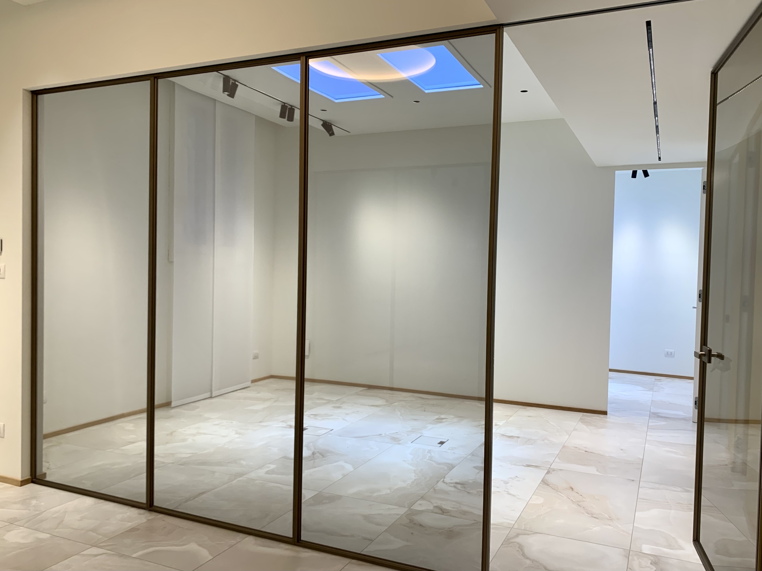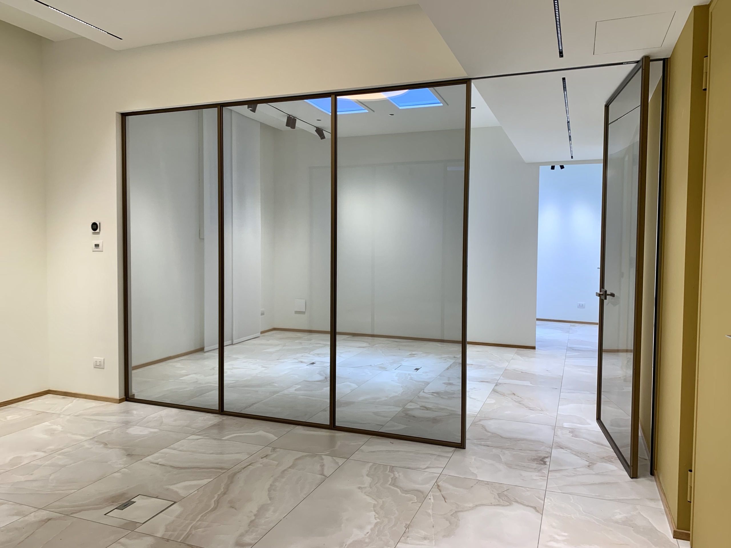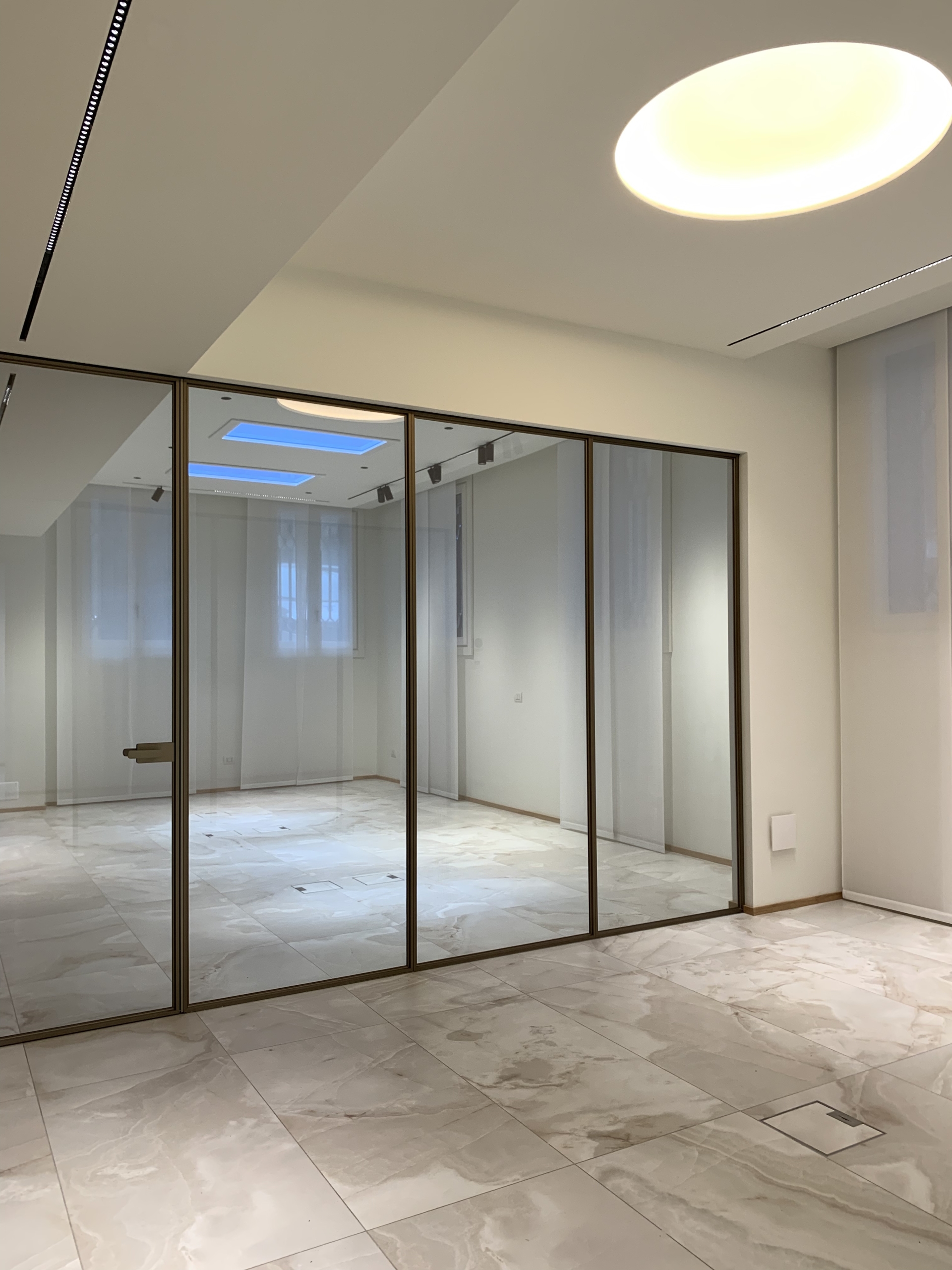 Lo spazio interno è cosi disposto: ingresso reception, due aree open-space, sala riunioni, ufficio direzionale, area server, area break, 2 servizi igienici.